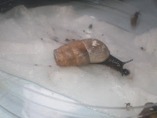 The snails do not seem to predate their own species, even when transported in close confinement. They can be kept in a large tupperware container, as long as there is space for 4-5cm of soil, and at least 10cm free space above the soil layer. For this species are use an approximately cubical container, withs ides of length 20cm. This is suitable for 3-4 adults. The soil should be kept mosit at all times. The snails may benefit from a period of drying out (maybe 4-6 weeks) to replicate summer conditions but sof ar this has proved unnessecary in my breeding attempts.
