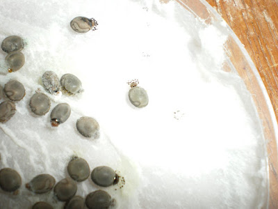 This mould appeared over the weekend. The eggs of phasmids are pretty tough, and generally survive attacks by mould. In this case the mould is removed by gently rubbing the eggs. Mould can also be controlled by allowing the eggs to dry out for a short period fairly regularly. It is possible to sterilise the surface of various butterfly eggs using dilute sterilisiation solutions, so I may give it a try as a mini-experiment.