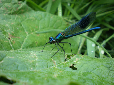 Banded Demoiselle, Calopteryx splendens (Harris, 1782), is a well know and familiar damselfly. This adult male was found resting on grass along the banks of the River Thames at Windsor. Useful things to note are the metallc blue wing veins and the coloured band on the wings, although this is variable. Females are metallic green, with metallic green wing veins and no banding on the wings, although again these may vary!