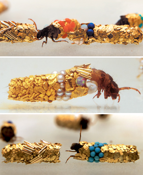 Caddis fly larvae are known to incorporate bits of whatever they can find into their cocoons, be it fish bone or bits of leaves. However when placed in a tank with flakes of gold and gemstones, the caddis flies simply create their protective sheaths from these materials instead.