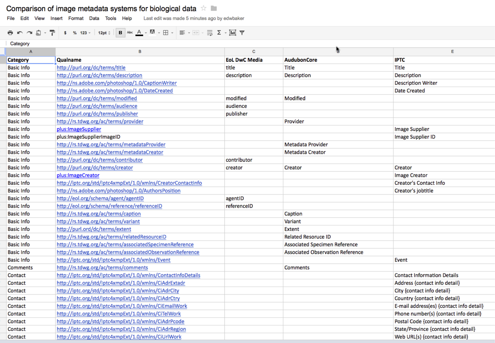 As part of the eMonocot and Scratchpads projects I have been doing some research to help us decide what metadata we will allow users to add to media by default. For images the International Press Telecommunications Council (IPTC) standard is generally considered de facto. While it forms a good basis for the curation of metadata of biological images and videos, in itself it is inadequate. Two schemes for extending this basis are the EoL Media DarwinCore extension and the more comprehensive Audubon Core (a proposed TDWG standard).In order to compare and contrast these three standards to aid in our decision making I created this spreadsheet which may be of use to others.