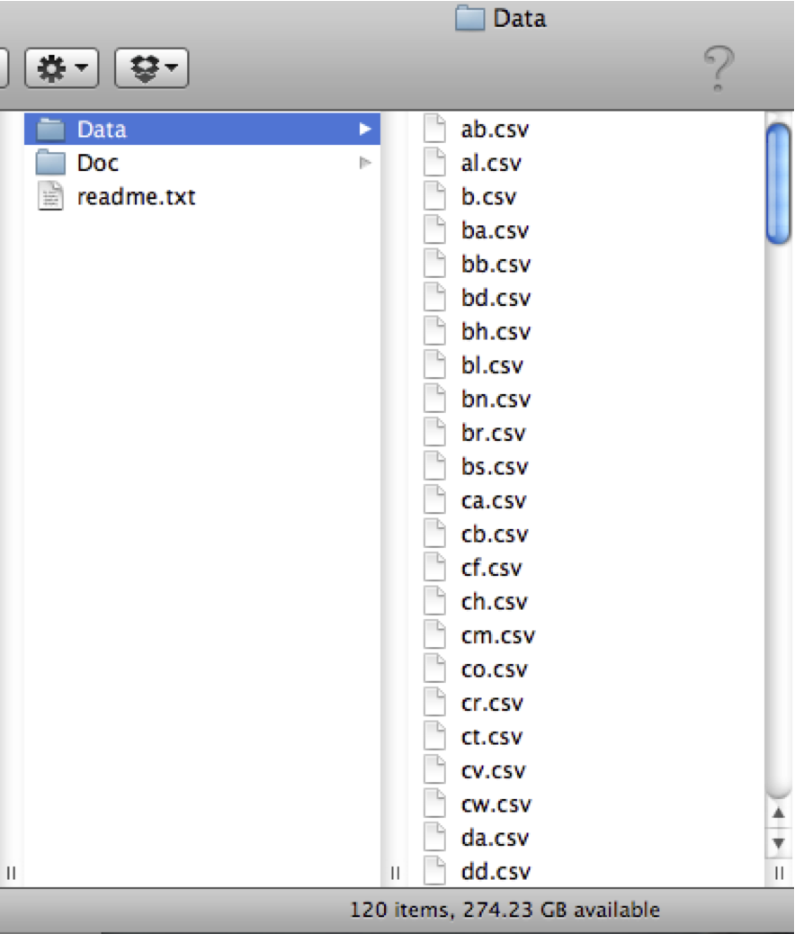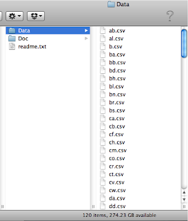 cat *.csv > aall.csvThe resulting all.csv file is pretty large (156MB-ish). Calling it aall.csv instead of all.csv just puts it at the top of the list which appeals to my aesthetic sense.
