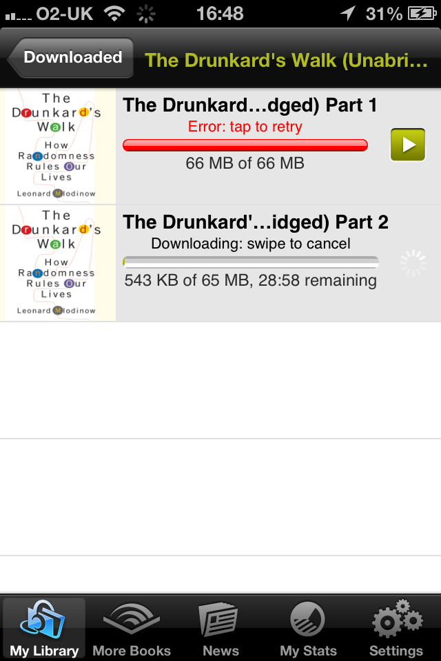 This is an annoying bug I have found in the latest Audible for iPhone app. Audiobooks seem to download entirely but the fact they have finished doesn't seem to register with the system. The result is the app crashes when you try to play them (or on start up) and you can't delete the files from your library. Everything is fine however if you are offline.