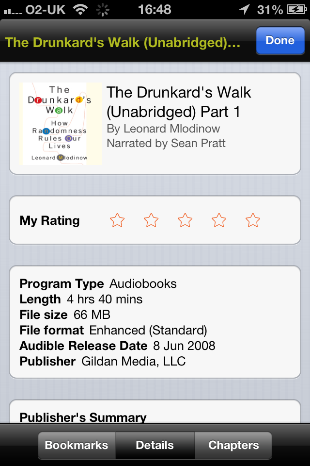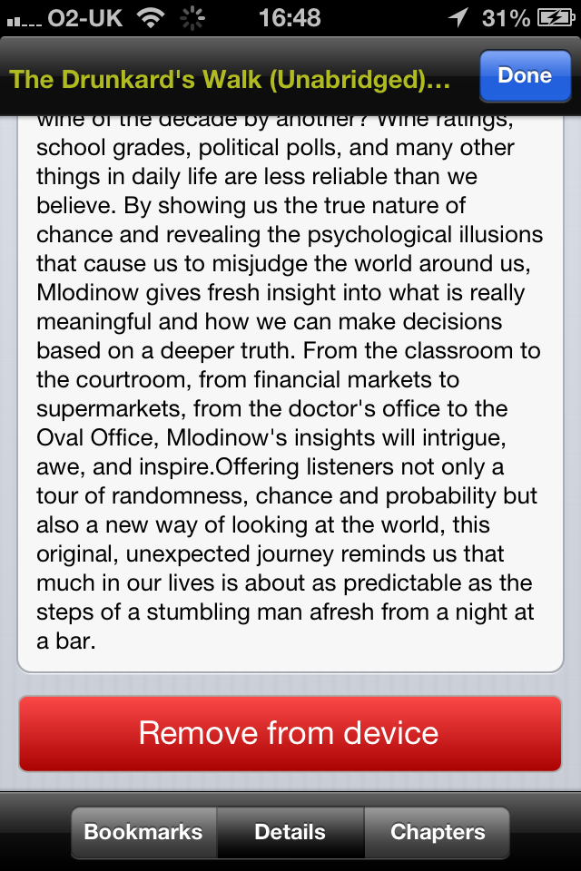 This problem can be fixed by turning your phone into airplane mode in Settings, and then reopening the app. You can now play the audio files without the app crashing - but it is still not possible to delete them from your Library, it is however still possibly to delete them via the Now Playing / Last Played screen. Play the troublesome file and then click the button in the top right of the screen to bring up the Bookmarks/Details/Chapters screen.