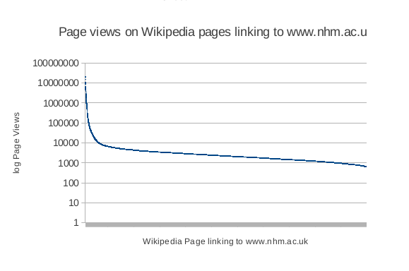 The graph below shows that of the 13,000+ articles linking to www.nhm.ac.uk most are in the long tail of page views, and relatively few articles with links to the NHM have over 1,000,000 page views.