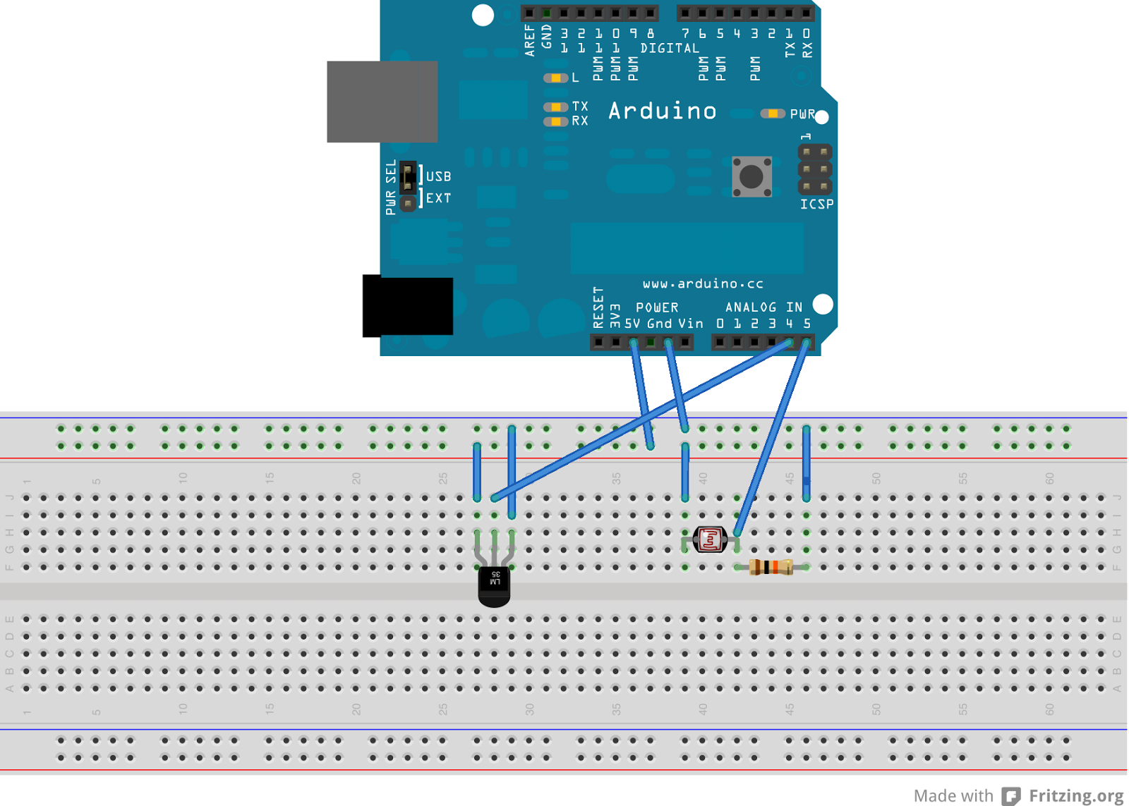 (The schematic was created using Fritzing.)The temperature is measured using an LM35 temperature sensor, and the light measured (imprecisely) using a photoresistor (which we could have calibrated but we just use to detect whether the light is on or off).
