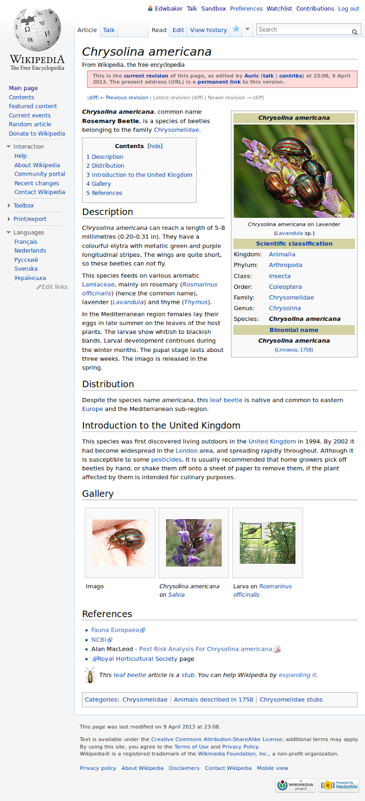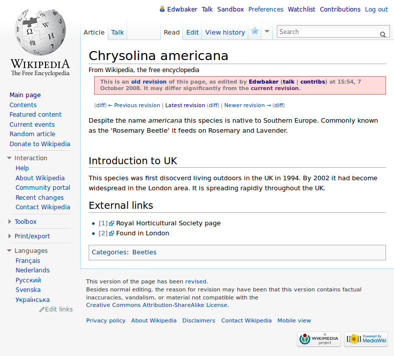 Way back in October 2008 I started a Wikipedia article on the Rosemary Leaf Beetle (Chrysolina americana) with barely a paragraph of text and a couple of references. It looked like this:I then forgot all about it, until I started reviewing some of my old Wikipedia edits since we got a Wikipedian in Residence at the Natural History Museum. Since my original and minor contribution the article has grown, although it still could be improved upon greatly. Out of curiosity I pulled up what all of the edits have looked like - it's quite interesting to watch the community come together and make continual gradual improvements.