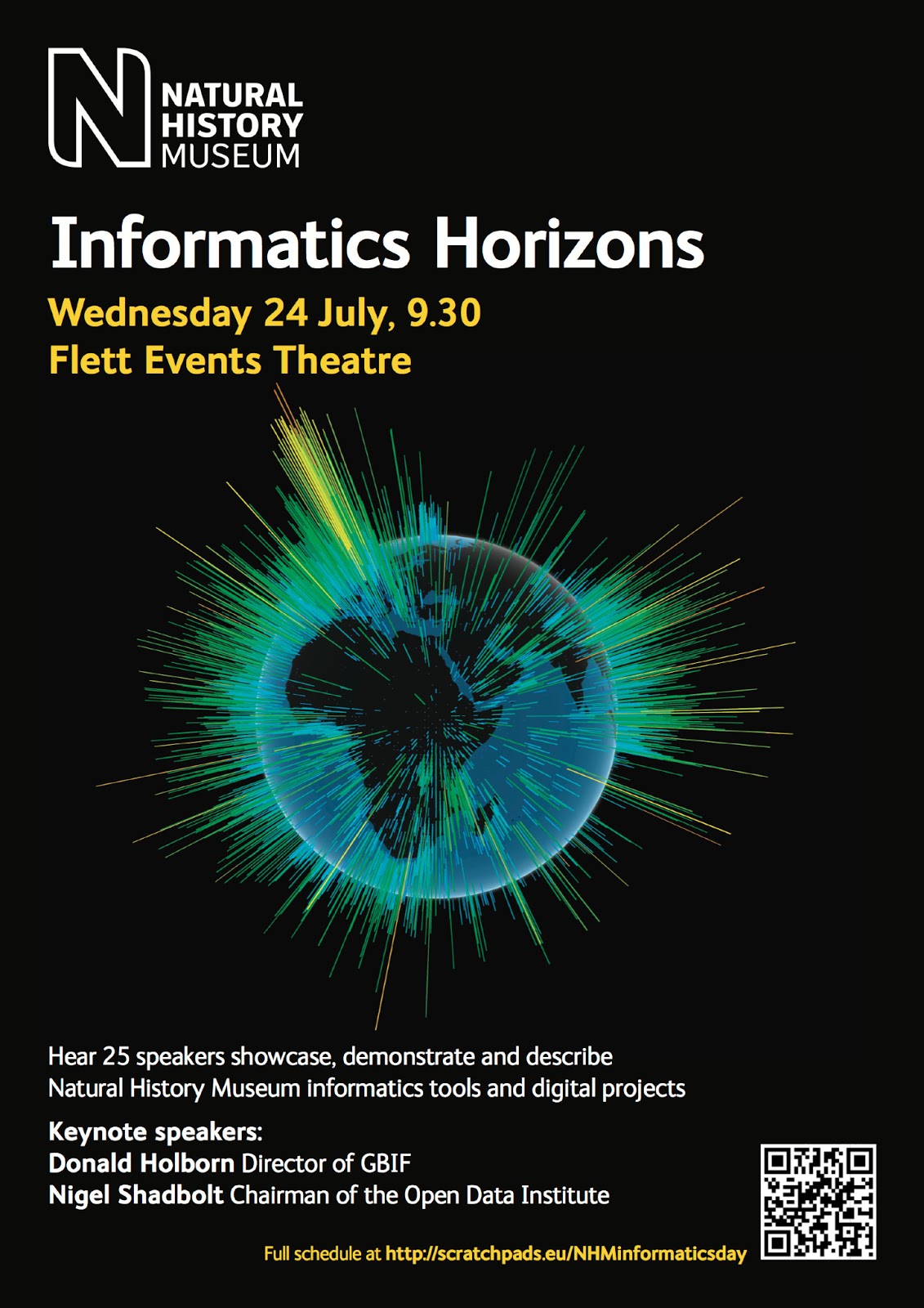 Informatics Horizons is an event on biodiversity informatics at the Natural History Museum, London focussing on the museum's work in this field. I will be giving three talks (one with Vince Smith). John Cummings (Wikimedian in Residence) at the museum will also be talking. The event will be live streamed here on the day.
