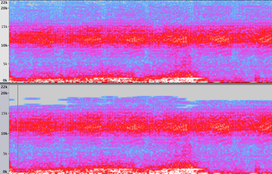 The spectrograms showing WAV (top) and MP3 (bottom) demonstrate what the effect of discarding higher frequencies has on visually identifiable features in the call. The WAV file shows clearly repeating sounds in the 17-21kHz range, while this information is lost in the MP3.